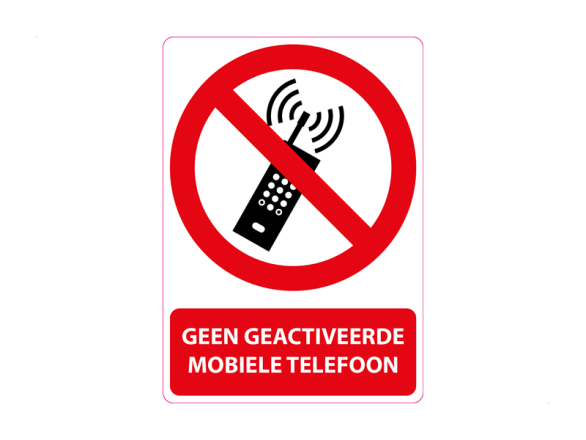 Doormiddel van deze sticker kun je op een eenvoudige manier aanduiden dat hier geen geactiveerde mobiele telefoons zijn toegestaan. Dit wordt weergegeven door een rond verbodsteken, waarin het pictogram van geen geactiveerde mobiele telefoons is afgebeeld. Dit wordt nog extra verduidelijkt met de Nederlandstalige tekst "GEEN GEACTIVEERDE MOBIELE TELEFOON".