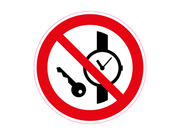 Met deze verbod sticker laat je op een duidelijke manier zien dat hier geen metalen artikelen of horloges zijn toegestaan. Dit symbool is weergegeven door een rond rood/wit verbod symbool met hierin een zwart pictogram.
