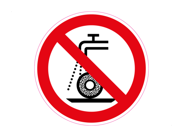 Met deze verbod sticker wordt aangegeven dat het niet gebruikt mag worden voor nat slijpen. Dit symbool is weergegeven door een rond rood/wit verbod symbool met hierin een zwart pictogram.